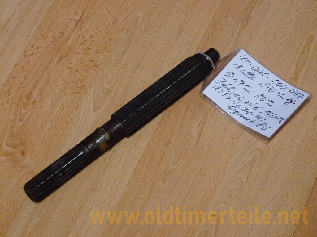 Shaft 290 mm long with single-sided pin 17 mm diameter. Shaft diameter in the centre 25 mm. Number of teeth 17/14. The item comes from a BMW new parts warehouse, which also contained a few parts from other manufacturers. |