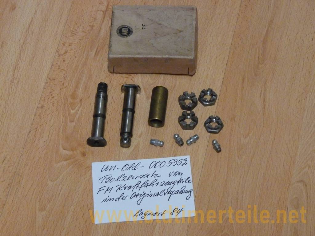 Bolt set consisting of 2 threaded bolts with an unknown logo recognizable as an open triangle with the tip pointing upwards and an M, etched number 102187, 4 crown nuts, 4 grease nipples, and a sleeve or bushing. The parts are in their original packaging with the inscription FM Kraftfahrzeugteile (FM automotive parts) and a stamp 76. The parts come from a liquidated automotive parts warehouse. |