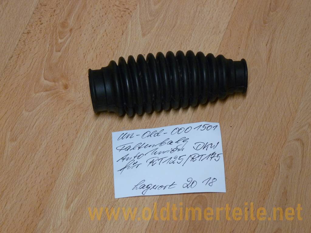 Faltenbalg Schlauchmanschette mit dem 4 Ringe Logo für die Auto Union. Eingegossene Nummern 4601 20262 03 5946 für DKW RT125/RT175 Die Teile stammen aus einem DKW Neuteilelager für Motorradteile