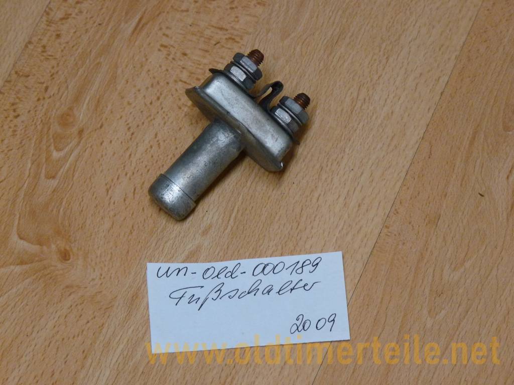 Foot switch ON/OFF, without brand designation, with 2 M8 connections. 85 mm total height, hexagonal mounting plate 55 mm, with 2 mounting holes Purpose or vehicle affiliation could not be determined. The item comes from a stock clearance for automotive parts |