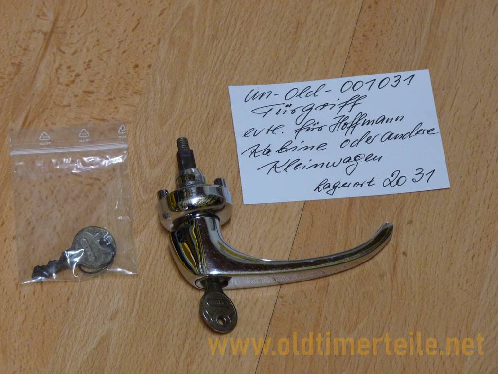 possibly suitable for Heinkel Kabine or other small cars from the 1950s to 1960s. The diameter of the dome is 37 mm. The diameter of the two drive pins is 6 mm, with a spacing of 28 mm. The handle comes with two keys. A new part that has never been installed, with signs of storage.