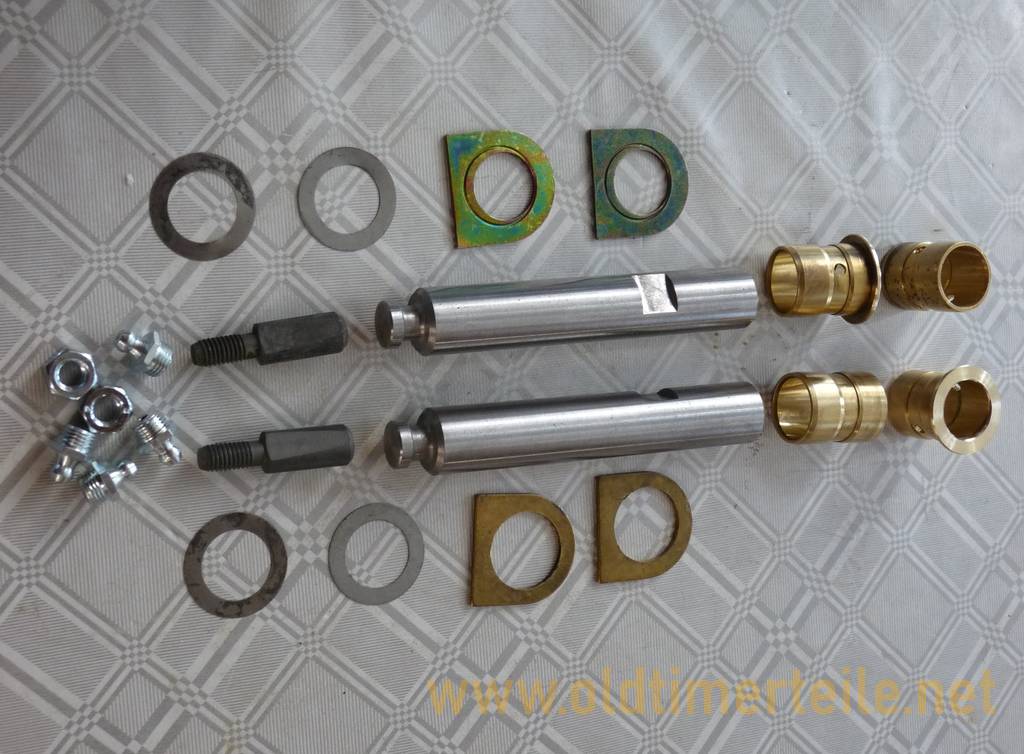 Steering knuckle bolt set for the complete Isetta front axle, comprising the following for both sides: 2 upper steering knuckle bushings 3-002 2 lower steering knuckle bushings 3-003 2 steering knuckle bolts 3-011 2 wedge bolts, complete 3-015 4 grease nipples 3-0121 2 pressure washers 24 mm, lower 3-013 2 pressure washers 20 mm, upper 3-0131 4 shims 20/30 mm 55-0200 |